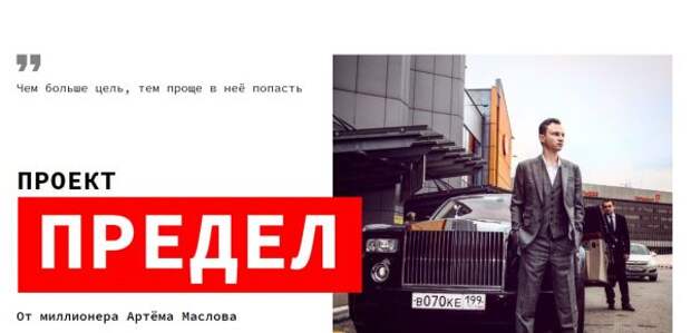 жили именно здесь.Оригинал На сайте «Предела» можно найти ролики с учениками Артёма, которые рекламируют его, и другие обычные атрибуты коучинговых проектов: мотивирующие фразы, фотографии на фоне люксовых автомобилей.